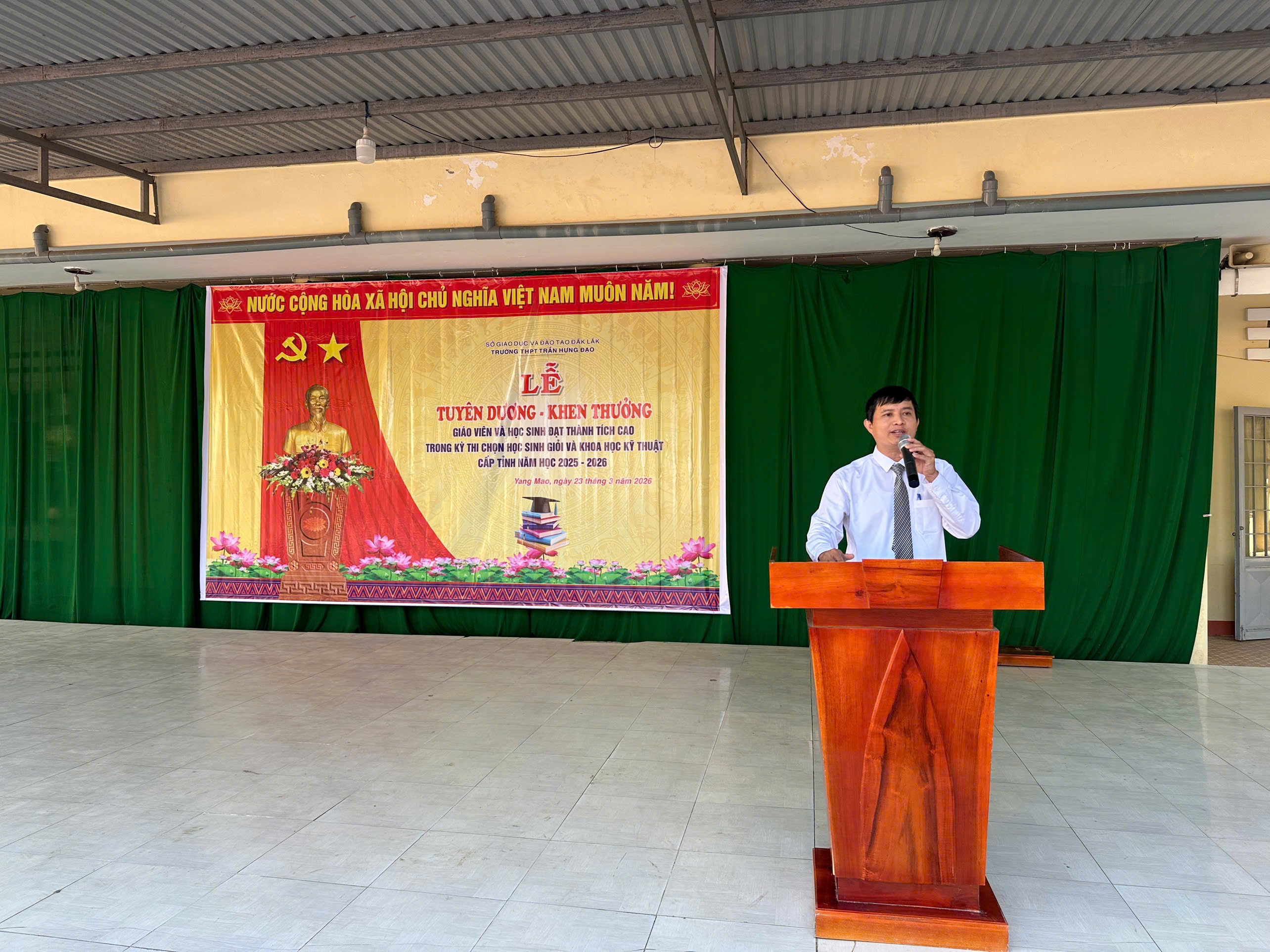Sáng ngày 23/3/2026, trường THPT Trần Hưng Đạo, xã Yang Mao long trọng tổ chức Lễ Tuyên dương, khen thưởng giáo viên và học sinh đạt thành tích cao trong kỳ thi chọn học sinh giỏi cấp tỉnh các môn văn hóa và nghiên cứu KH-KT cấp tỉnh, năm học 2025-2026. Tại lễ tuyên dương, có 7 giáo viên và 12 em học sinh vinh dự được tặng giấy khen và tiền thưởng kèm theo. Tham dự chương trình, có ông Trần Thế Thành – Hội trưởng hội cha mẹ học sinh cùng toàn thể CB, GV, NV nhà trường.